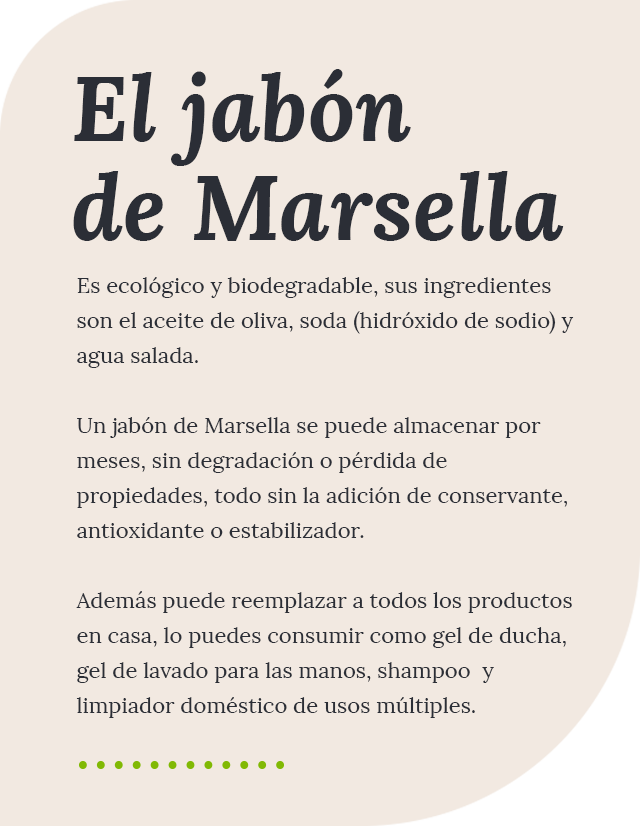 Un jabón de Marsella se puede almacenar por meses, sin degradación o pérdida de propiedades, todo sin la adición de conservante, atioxidante o estabilizador.